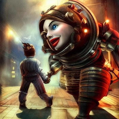 Prompt: Create a Big Sister and Little Daddy from Bioshick Video Game